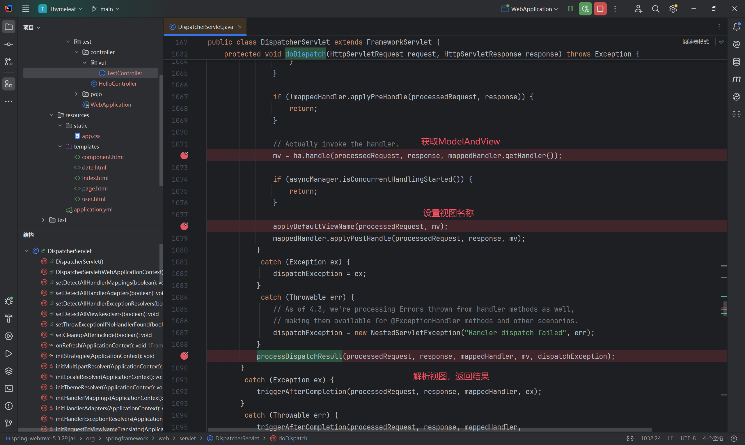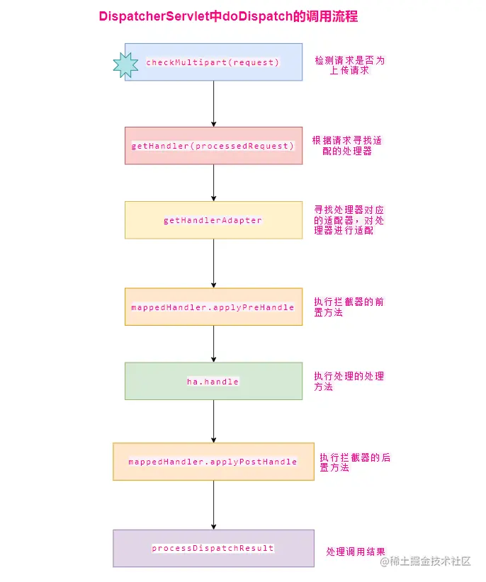 整个流程中最核心的部分位于 org.springframework.web.servlet.DispatcherServlet#doDispatch