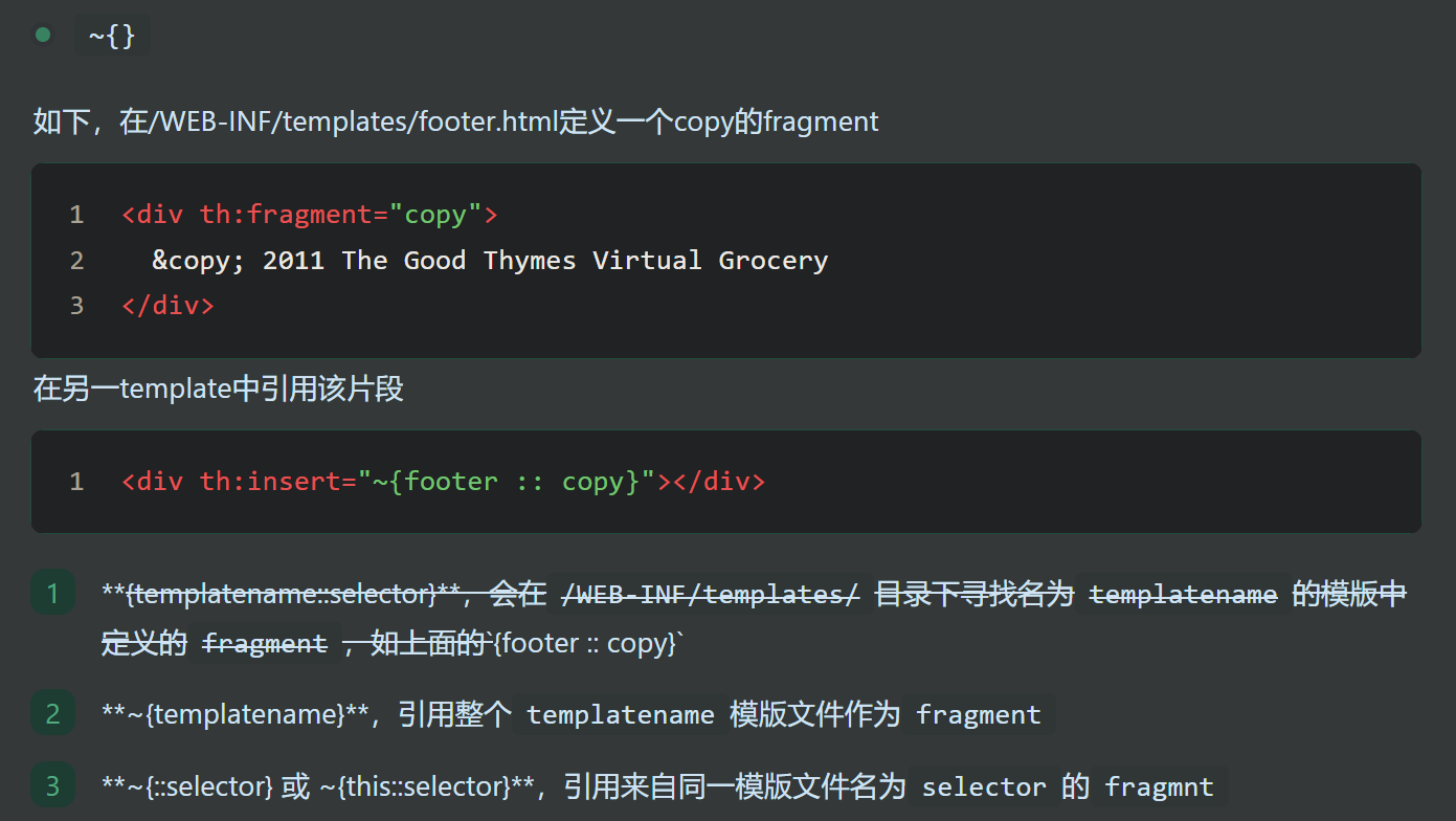 在 Thymeleaf 中 , :: 是片段选择符 , 一个使用例子如下 :