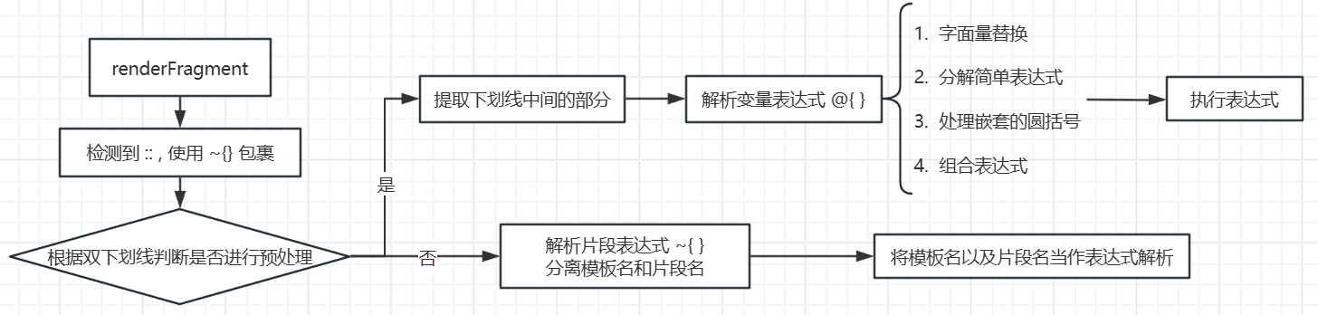 1 2 3 4 5 6 7 8 9 10 11 12 13 // 输入模板表达式 : "|欢迎 ${user.name} , 今天是 ${today}|" // 转换过程 : // 1. 遇到 | → 进入字面量替换模式 // 2. 遇到 "欢迎 " → 转换为 '欢迎 ' // 3. 遇到 ${user.name} → 转换为 + ${user.name} // 4. 遇到 " , 今天是 " → 转换为 + ' , 今天是 ' // 5. 遇到 ${today} → 转换为 + ${today} // 6. 遇到 | → 结束字面量替换模式 // 最终输出 : "'欢迎 ' + ${user.name} + ' , 今天是 ' + ${today}"