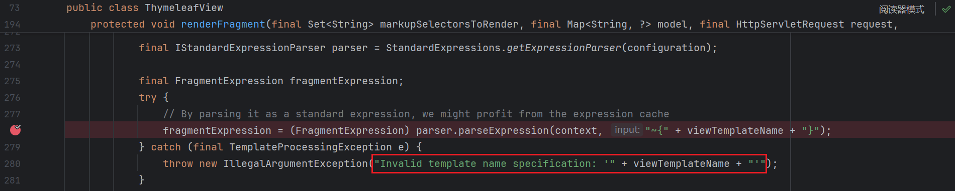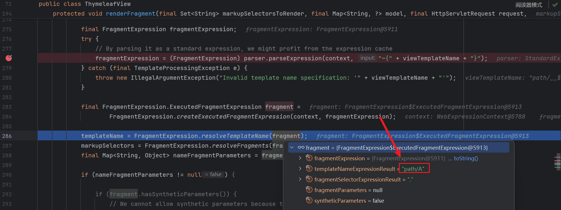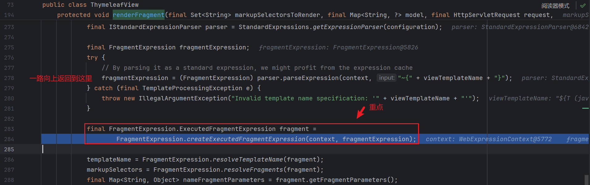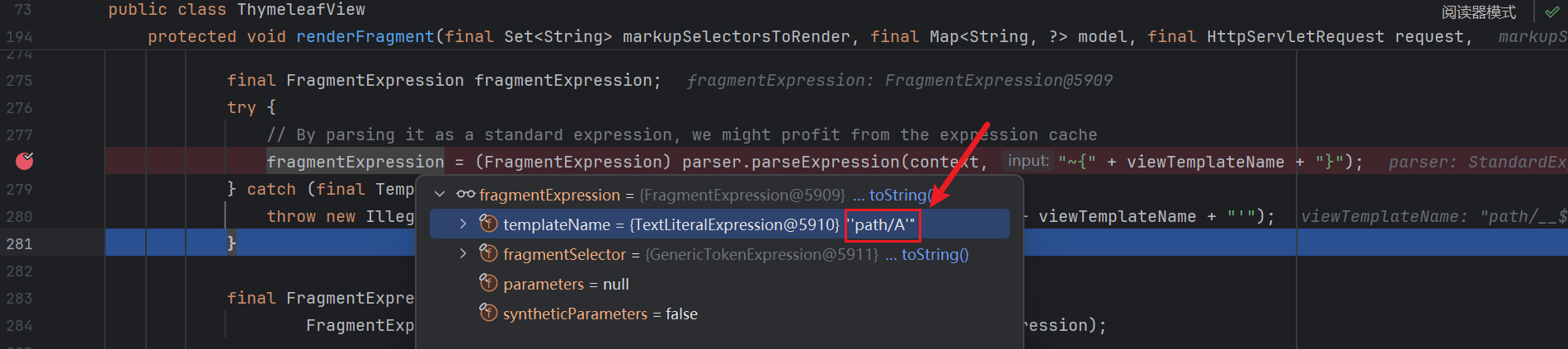 首先它会把 viewTemplateName 用 ~{} 包裹 , 变成一个片段表达式 ( 278 行 )