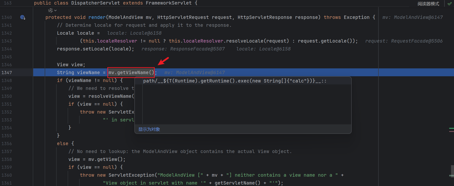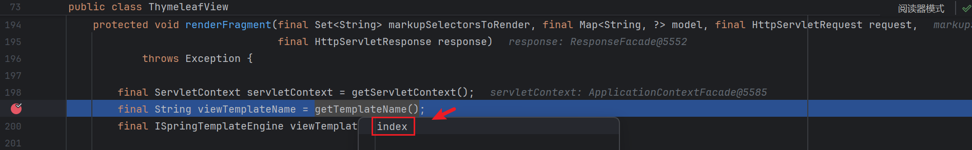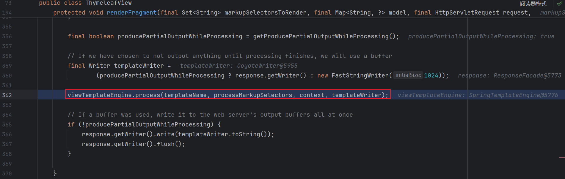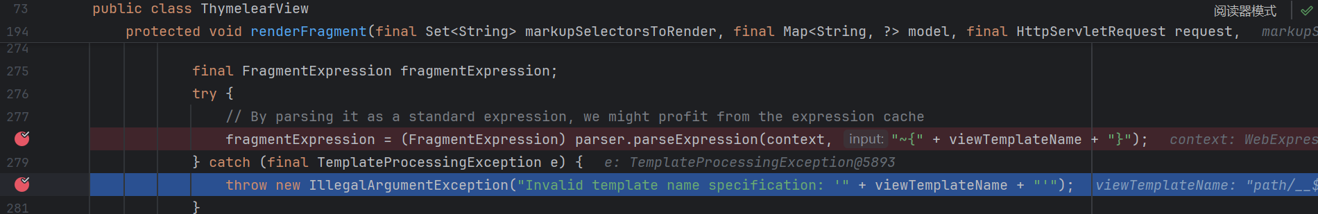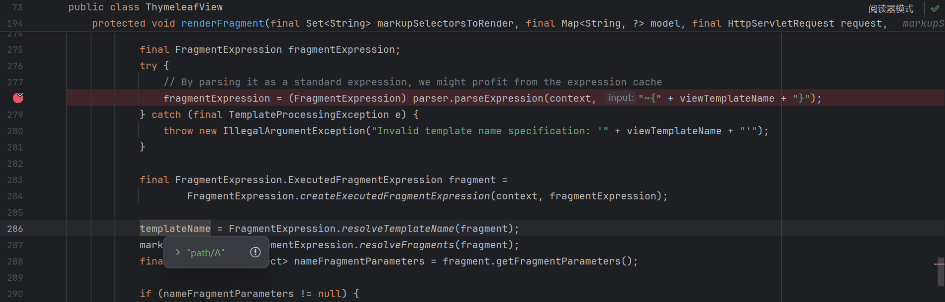首先它会把 viewTemplateName 用 ~{} 包裹 , 变成一个片段表达式 ( 278 行 )