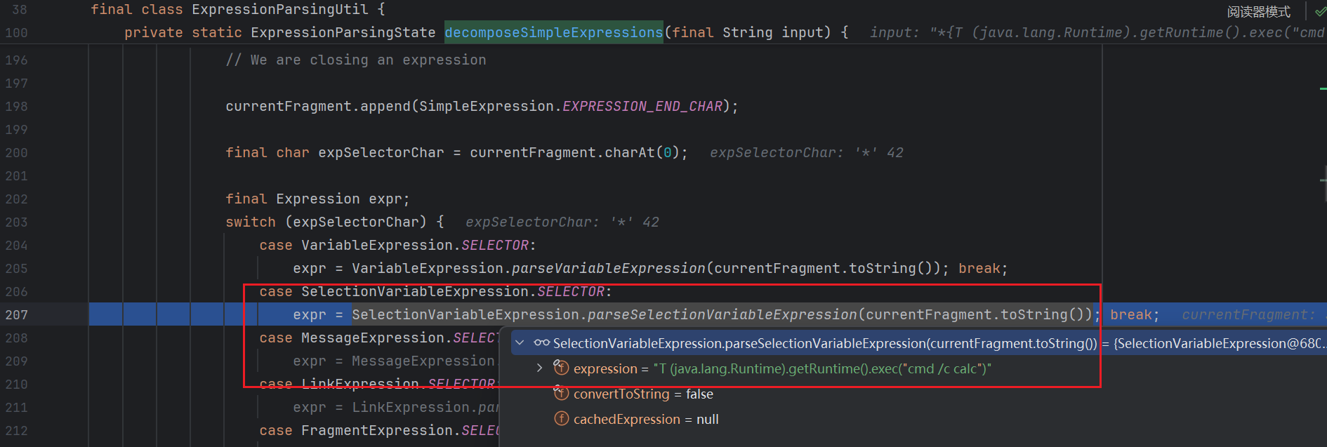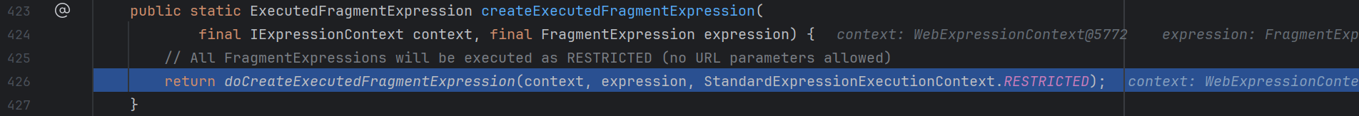 1 2 3 4 5 6 7 8 9 10 11 12 13 14 15 16 17 containsSpELInstantiationOrStatic:43 , SpringStandardExpressionUtils (org.thymeleaf.spring5.util) getExpression:367 , SPELVariableExpressionEvaluator (org.thymeleaf.spring5.expression) obtainComputedSpelExpression:315 , SPELVariableExpressionEvaluator (org.thymeleaf.spring5.expression) evaluate:182 , SPELVariableExpressionEvaluator (org.thymeleaf.spring5.expression) executeVariableExpression:166 , VariableExpression (org.thymeleaf.standard.expression) executeSimple:66 , SimpleExpression (org.thymeleaf.standard.expression) execute:109 , Expression (org.thymeleaf.standard.expression) execute:138 , Expression (org.thymeleaf.standard.expression) preprocess:91 , StandardExpressionPreprocessor (org.thymeleaf.standard.expression) parseExpression:120 , StandardExpressionParser (org.thymeleaf.standard.expression) parseExpression:62 , StandardExpressionParser (org.thymeleaf.standard.expression) parseExpression:44 , StandardExpressionParser (org.thymeleaf.standard.expression) renderFragment:282 , ThymeleafView (org.thymeleaf.spring5.view) render:190 , ThymeleafView (org.thymeleaf.spring5.view) render:1373 , DispatcherServlet (org.springframework.web.servlet) processDispatchResult:1118 , DispatcherServlet (org.springframework.web.servlet) doDispatch:1057 , DispatcherServlet (org.springframework.web.servlet)