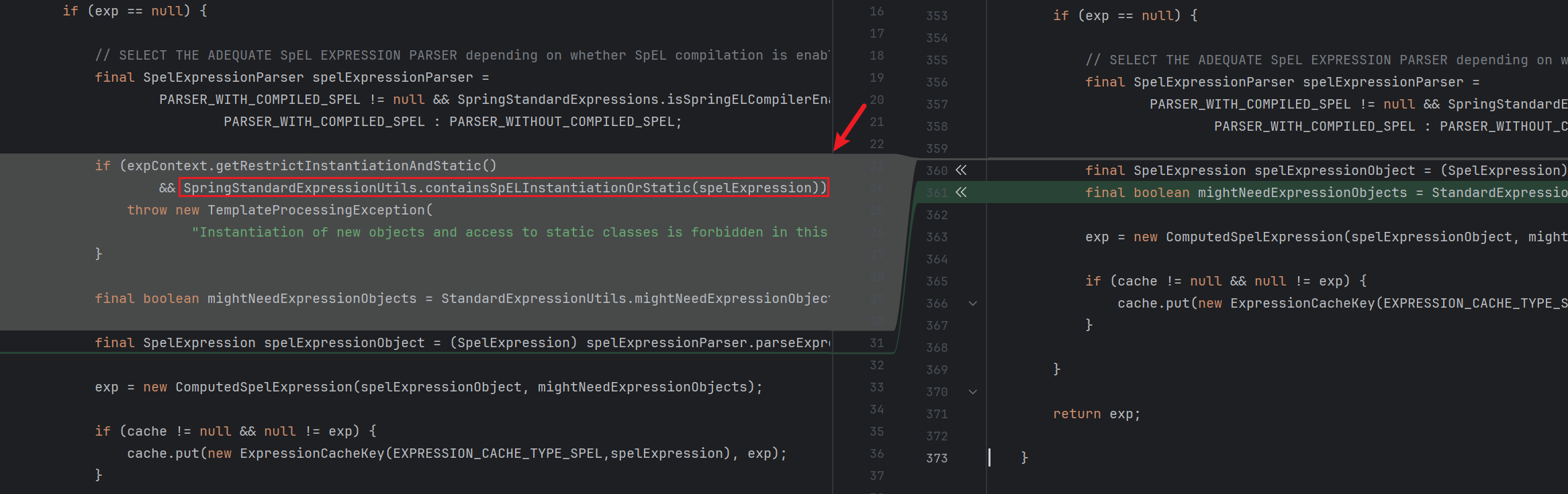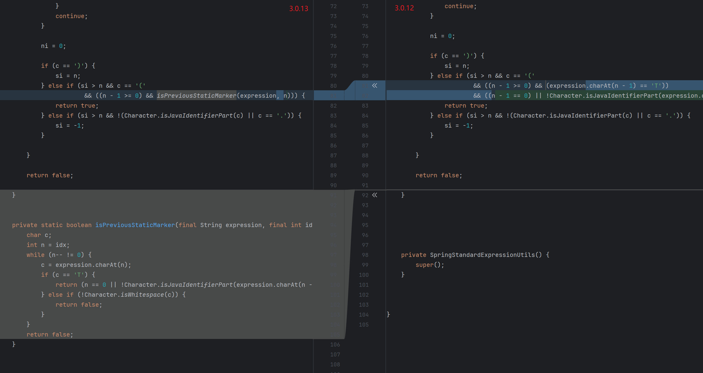 1 2 3 4 5 6 7 8 9 10 11 12 13 14 15 16 17 18 19 20 21 22 23 24 25 26 27 28 29 30 31 32 33 34 35 36 37 38 39 40 41 42 43 44 45 46 47 48 49 50 51 52 53 54 55 56 57 58 59 60 61 public static boolean containsSpELInstantiationOrStatic (final String expression) { final int explen = expression.length(); int n = explen; int ni = 0 ; int si = -1 ; char c; while (n-- != 0 ) { c = expression.charAt(n); if (ni < NEW_LEN && c == NEW_ARRAY[ni] && (ni > 0 || ((n + 1 < explen) && Character.isWhitespace(expression.charAt(n + 1 ))))) { ni++; if (ni == NEW_LEN && (n == 0 || !Character.isJavaIdentifierPart(expression.charAt(n - 1 )))) { return true ; } continue ; } if (ni > 0 ) { n += ni; ni = 0 ; if (si < n) { si = -1 ; } continue ; } ni = 0 ; if (c == ')' ) { si = n; } else if (si > n && c == '(' && ((n - 1 >= 0 ) && (expression.charAt(n - 1 ) == 'T' )) && ((n - 1 == 0 ) || !Character.isJavaIdentifierPart(expression.charAt(n - 2 )))) { return true ; } else if (si > n && !(Character.isJavaIdentifierPart(c) || c == '.' )) { si = -1 ; } } return false ; }